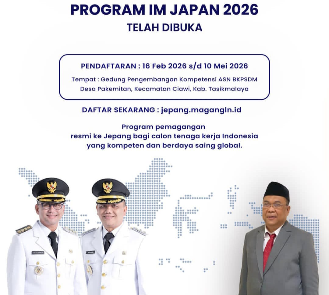Kabupaten Tasikmalaya, QJabar — Pemerintah Kabupaten Tasikmalaya melalui DPMPTSPTK menginformasikan kepada masyarakat bahwa pendaftaran Program Pemagangan ke Jepang IM Japan Tahun 2026 resmi dibuka. Program ini merupakan kerja sam...