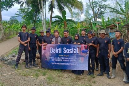 Kab.Ciamis Qjabar- Dalam rangka memperingati Hari Ulang Tahun ke-4 Brimob Polda Jabar Batalyon D Pelopor Cineam Tasikmalaya, jajaran personel melaksanakan kegiatan bakti sosial kerja bakti peletakan b...