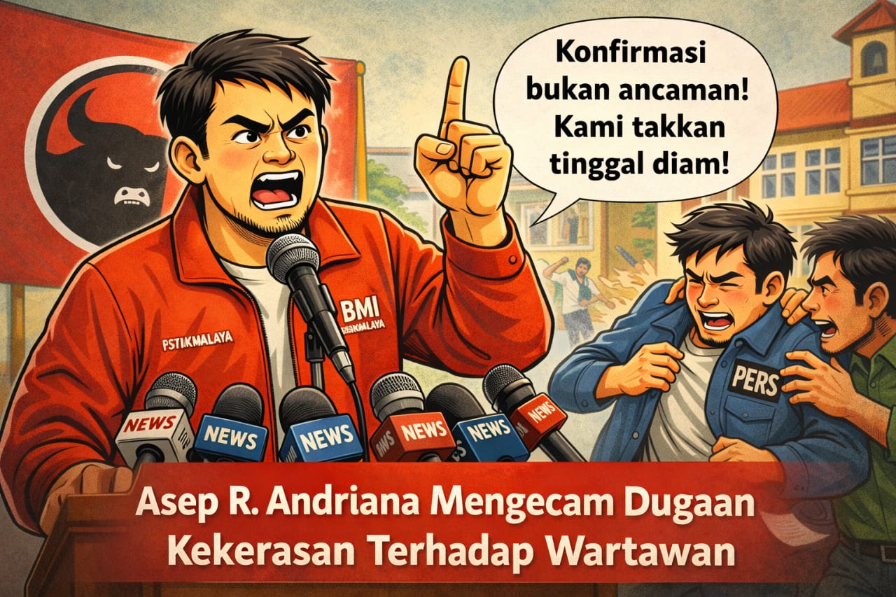 Tasikmalaya Qjabar – Ketua Dewan Pimpinan Cabang Banteng Muda Indonesia (DPC BMI) Kota Tasikmalaya, Asep R. Andriana, mengecam keras dugaan tindakan kekerasan dan intimidasi yang dialami seorang wartawan saat menjalankan tugas jurnalistik di lingkungan sekolah negeri di Kota Tasikmalaya.Rabu 24 Desember 2025.