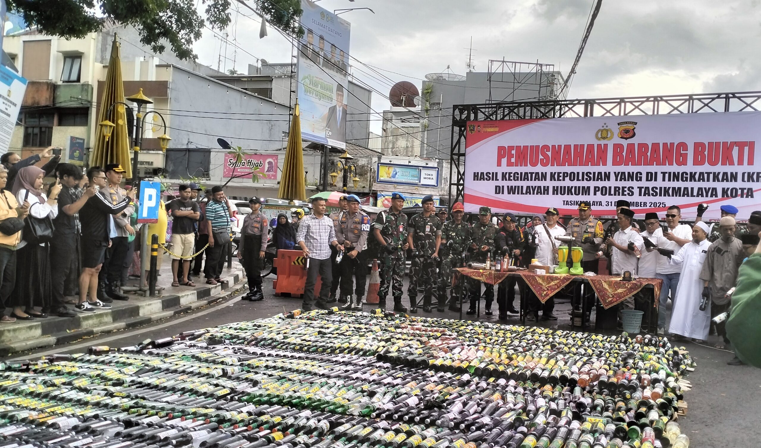 Kota Tasik,QJabar.com – Polres Tasikmalaya Kota melaksanakan kegiatan pemusnahan barang bukti hasil operasi bersama unsur TNI, Satpol PP, dan berbagai stakeholder terkait. Kegiatan rutin yang digelar setiap 3 bulan ini menjadi yang ke-4 dalam tahun ini, dengan lokasi pelaksanaan di Taman Kota Tasikmalaya dan dihadiri Forkopimda, para alim ulama, serta perwakilan ormas keagamaan dan masyarakat.