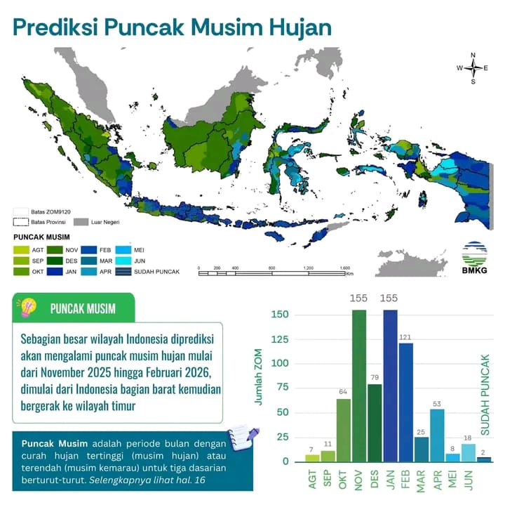 Jakarta, Qjabar  – Badan Meteorologi, Klimatologi, dan Geofisika (BMKG) mengingatkan semua pihak untuk siaga menghadapi puncak musim hujan yang diperkirakan berlangsung mulai November 2025 hingga Februari 2026, Minggu 2 November 2025.